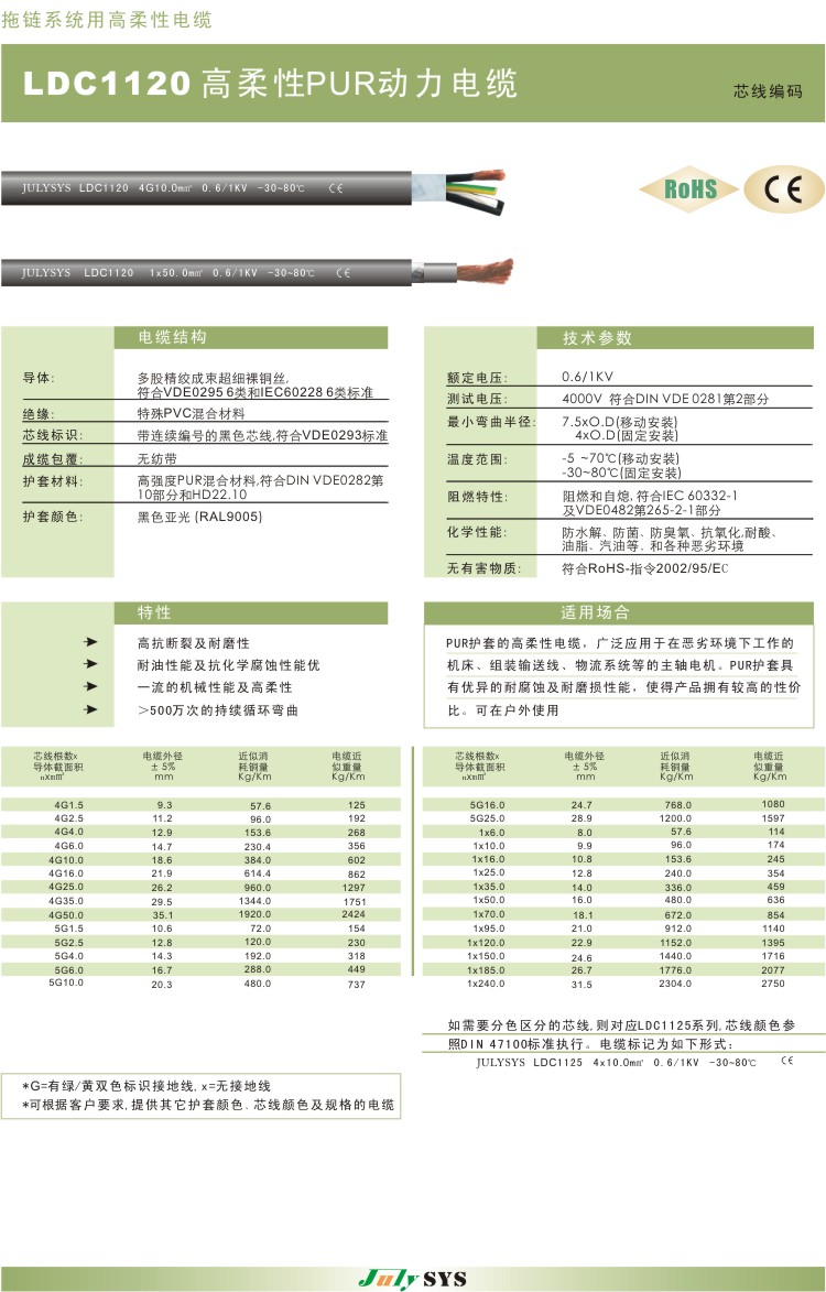 拖链系统用高柔性PUR动力电缆 LDC1120系列