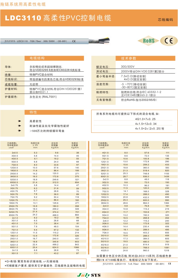拖链系统用高柔性PVC控制电缆 LDC3110系列