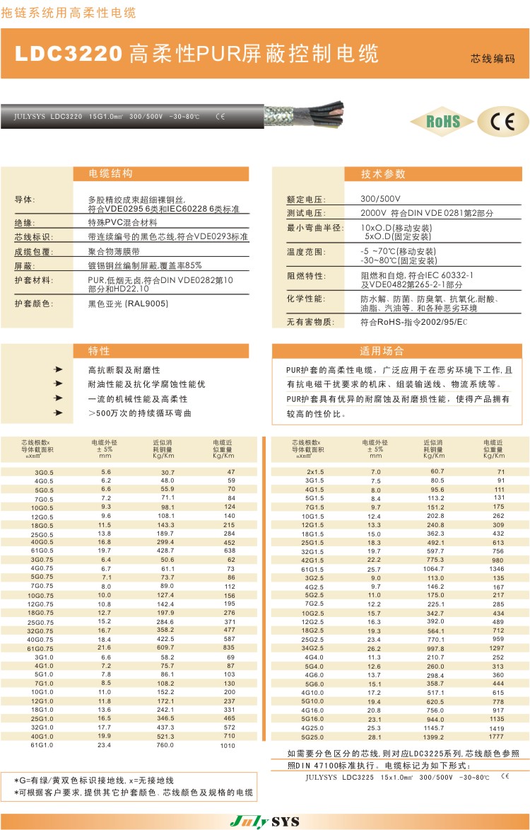 拖链系统用高柔性PUR屏蔽控制电缆 LDC3220系列